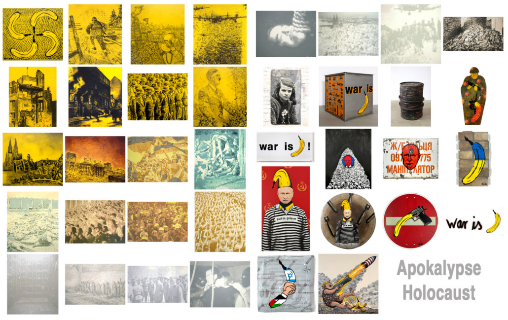 Formal knüpft dieser Werkblock an Strategien der Appropriation Art und der kritischen Geschichtsreflexion an, wie sie seit den 1980er-Jahren in der deutschen Kunst verstärkt auftreten. Anders als eine rein dokumentarische Darstellung zielt Baumgärtel jedoch auf eine emotionale und moralische Aktivierung des Betrachters. Die wiederkehrende Banane – sein Markenzeichen – erscheint hier in politisch aufgeladener Brechung: nicht als humorvolle Geste, sondern als irritierender Eingriff in das historische Bildgedächtnis. Sie destabilisiert den rein musealen Blick und verweist auf die Frage nach heutiger Verantwortung im Umgang mit Geschichte.