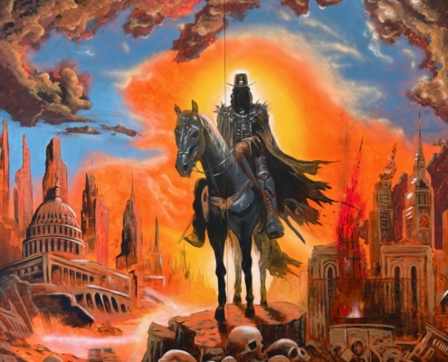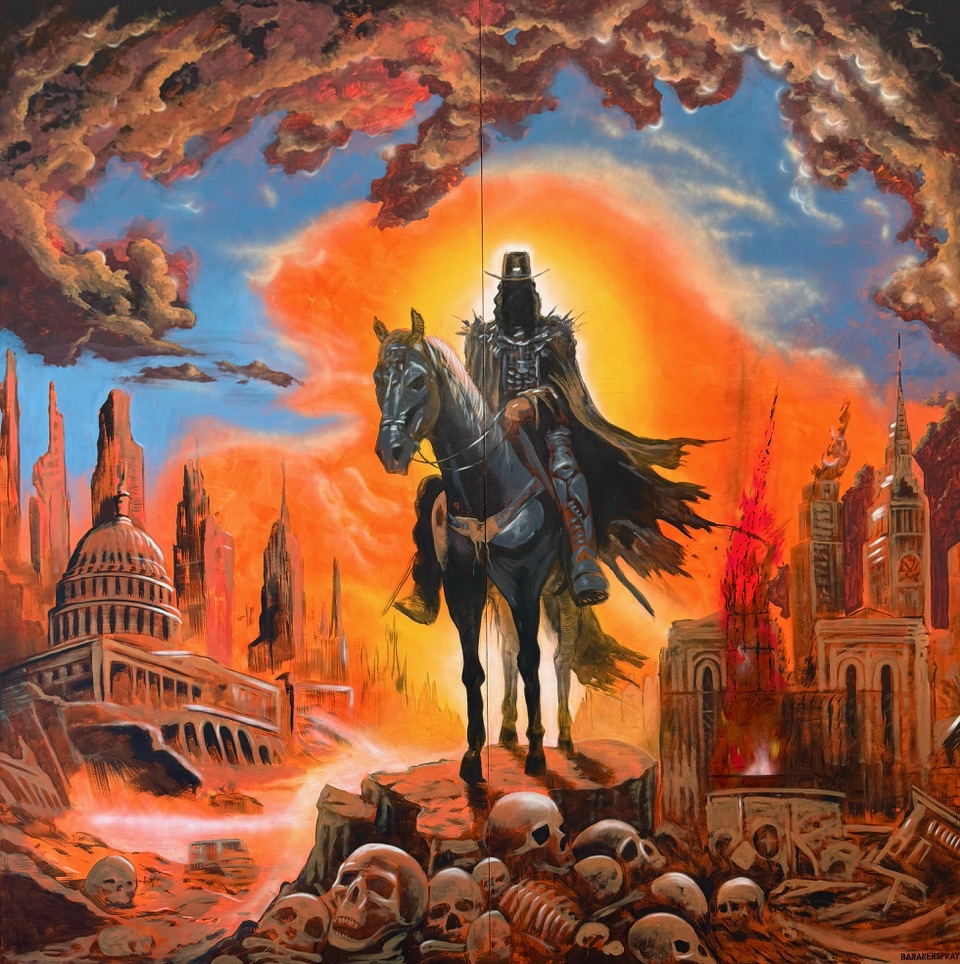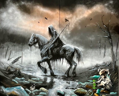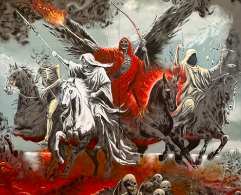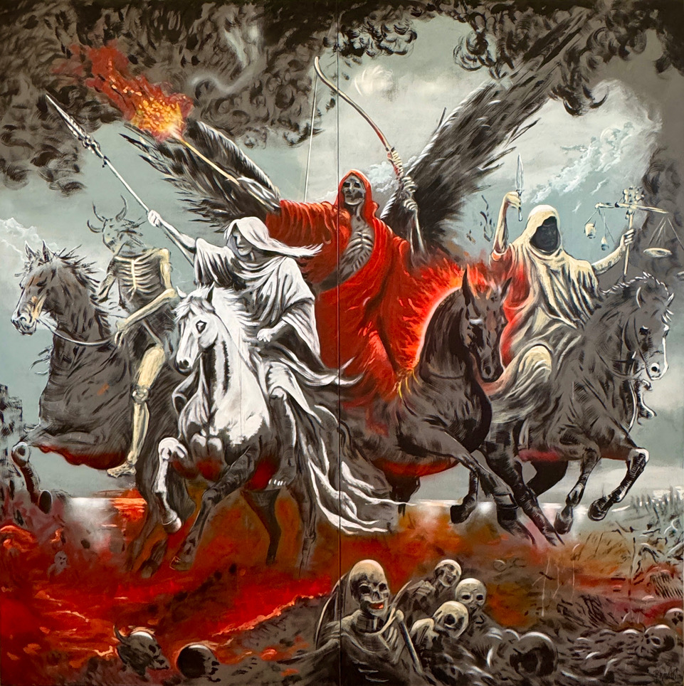Mit dem groß angelegten Projekt „Apokalypse“ widmet sich Thomas Baumgärtel einem der gewaltigsten Bildmotive der abendländischen Kultur: den Vier apokalyptischen Reitern aus der biblischen Offenbarung des Johannes. Die Werkgruppe besteht aus vier monumentalen Gemälden, jeweils etwa 4 x 4 Meter groß und einem Gemälde 150 x 150 cm, die thematisch und formal das klassische Endzeitnarrativ in einen hochaktuellen, gesellschaftskritischen Kontext überführen.