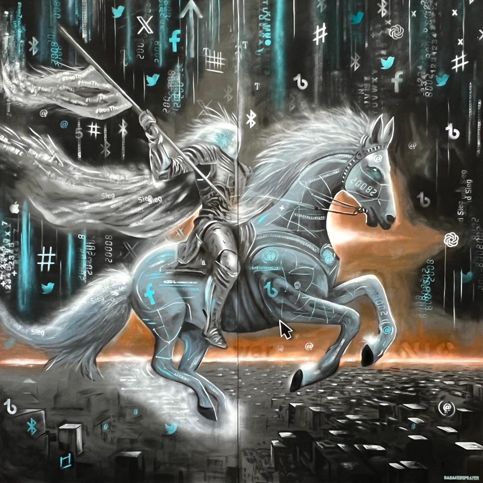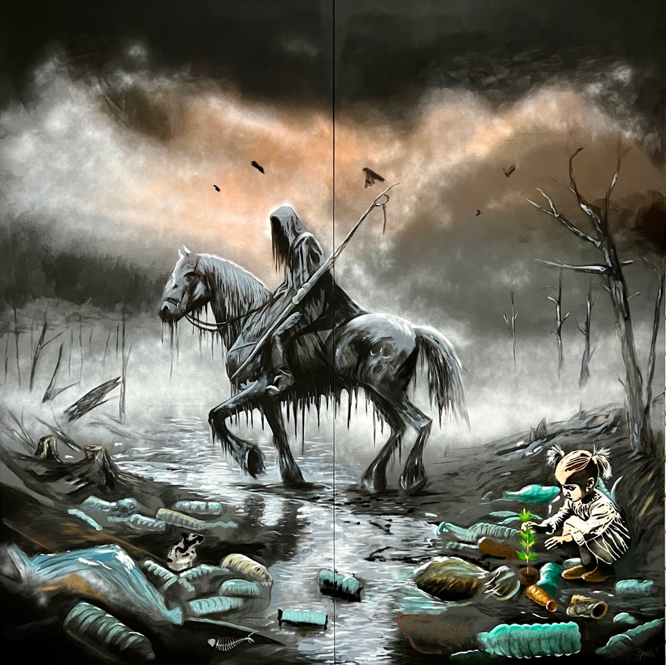 Im Dialog mit der Werkgruppe „Apokalypse“ verschiebt sich der Fokus von der historischen Singularität der Shoah hin zu einer universellen, zeitübergreifenden Dimension von Bedrohung. Während der Werkblock „Holocaust“ auf die konkret geschehene Katastrophe des 20. Jahrhunderts verweist, visualisieren die apokalyptischen Reiter eine potenzielle Zukunft. Krieg, digitale Manipulation, ökologische Verwüstung und autoritäre Macht erscheinen als neue Reiter einer selbstverschuldeten Endzeit.