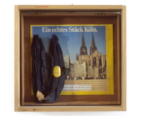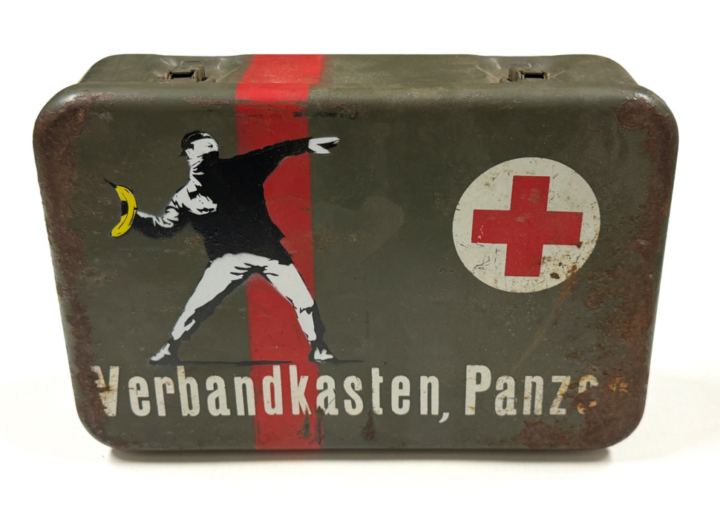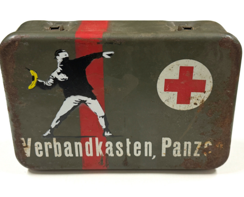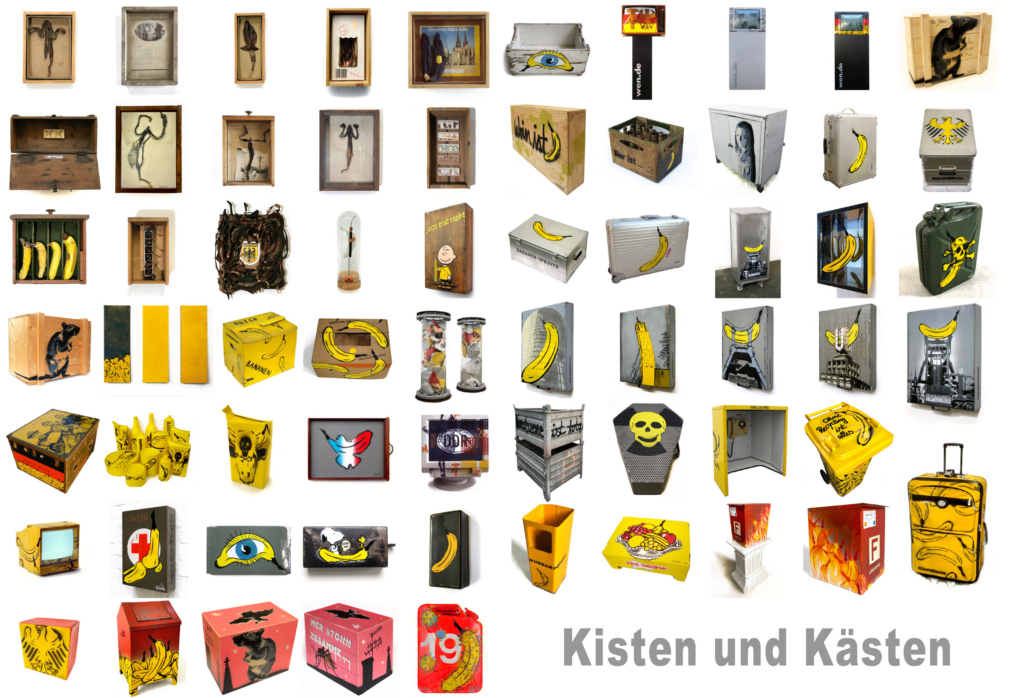 Die Werkgruppe zeigt, wie alltägliche Gegenstände zu Trägern von Bedeutung werden können. Ausgangspunkt sind einfache Behälter – Holzkisten, Metallboxen, Koffer oder Verpackungen –, die ursprünglich zum Aufbewahren, Transportieren oder Schützen gedacht sind. Baumgärtel greift diese Dinge auf, verändert sie durch Übersprühen, Bemalen oder Bekleben und verschiebt sie so aus ihrem gewohnten Zusammenhang. Dadurch verlieren sie ihre rein praktische Funktion und werden zu eigenständigen Bildträgern.